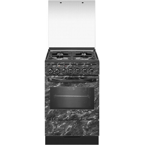 Габаритные размеры ШхГхВ: 50х58.5х85 см * Цвет: черный с рисунком "мрамор". Варочная поверхность: эмалированная * Объём духовки: 55 л. Духовка: электрическая * Вертел с электроприводом * Съемные проволочные направляющие духовки * Выдвижной ящик для посуды и принадлежностей * Таймер электромеханический * Газ-контроль горелок стола * Терморегулятор (термостат) * Гриль электрическийУсиленный гриль с конвекцией * Ножки регулировочные * Чугунные решетки горелок стола * Подсветка духовки одинарная * Электророзжиг горелок, встроенный в ручки *