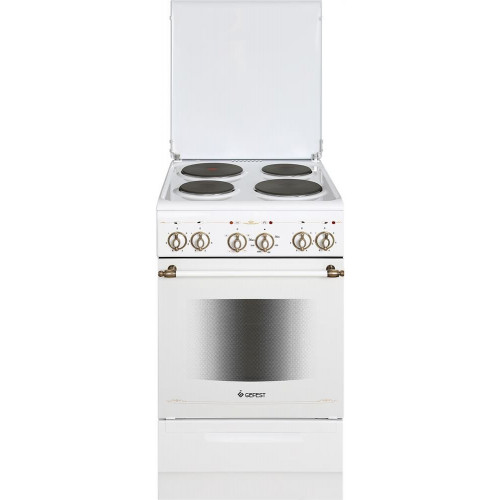 Габариты, ШхГхВ, см: 50x58.5x85; Цвет: с рисунком "ретро", белый; Дизайн: ретро; Ширина, см: 50; Фасад: эмалированный; Варочная поверхность: эмалированная; Крышка стола: металлическая крышка; Количество зон приготовления: 4; Класс энергоэффективности: А; Диапазон номинальных напряжений, В: 220-230; Номинальная потребляемая мощность электроэнергии, кВт: 5,05-5,52; Объем духовки, л: 55; Мощность верхнего ТЭН духовки, кВт: 0,8; Мощность нижнего ТЭН духовки, кВт: 1,2; Управление: механическое; Подсветка духовки: одинарная; Направляющие духовки: штампованные; Терморегулятор; Ящик для посуды и принадлежностей: выдвижной ящик; Ножки регулировочные; Сетевой шнур и вилка: в наличии; Комплектность: решетка духовки, жаровня 2 шт