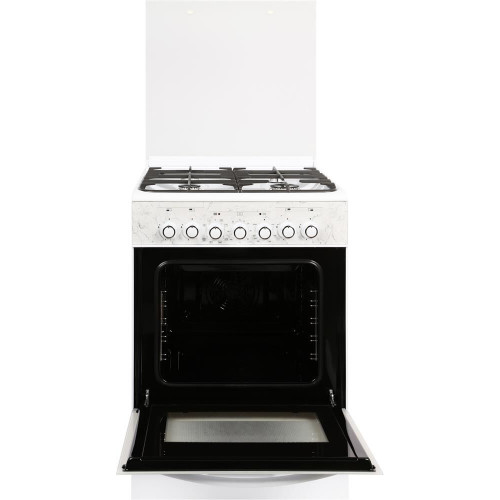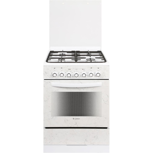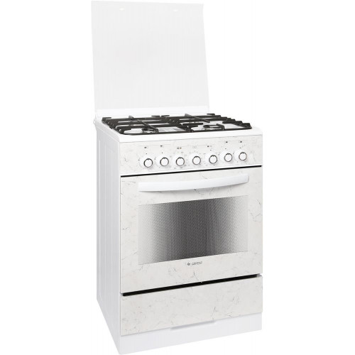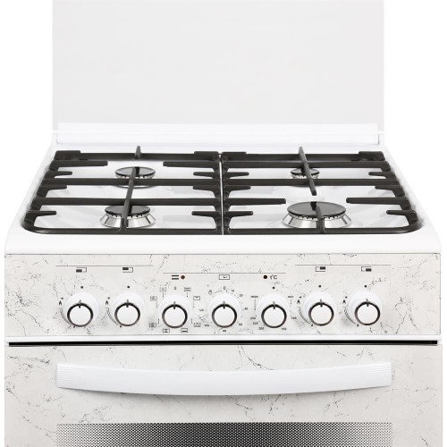 Габаритные размеры ШхГхВ: 60х60х85 см * Цвет: белый с рисунком "мрамор". Варочная поверхность: эмалированная * Объём духовки: 55 л * Вертел с электроприводом * Таймер электромеханический * Газ-контроль горелок стола * Терморегулятор (термостат) * Гриль электрический * Чугунные решетки горелок стола * Подсветка духовки двойная * Электророзжиг горелок, встроенный в ручки * Съемные проволочные направляющие духовки *