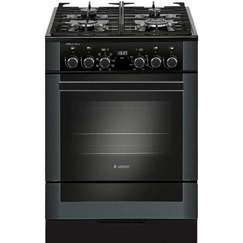 Габариты, ШхГхВ, см: 60x60x85; Цвет: черный; Дизайн: классический; Ширина, см: 60; Фасад: закаленное стекло; Варочная поверхность: закаленное стекло; Решетки стола: чугунные; Присоединительная резьба газопровода: G 1/2; Класс энергоэффективности: A; Номинальная потребляемая мощность электроэнергии, кВт: 3,0-3,28; Тип духовки: электрическая; Мощность верхнего ТЭН духовки, кВт: 0,8; Мощность нижнего ТЭН духовки, кВт; 1,2; Мощность ТЭН вентилятора, кВт: 2,0; ТЭН-гриль: 1,2; Объем духовки, л: 55; Таймер: сенсорный; Двухзонная горелка; Газ-контроль горелок стола; Электророзжиг горелок стола: встроен в ручки; Гриль: электрический; Вертел с электроприводом; Шашлычница; Конвекция; Подсветка духовки: двойная; Направляющие духовки: съемные проволочные; Терморегулятор (термостат); Ящик для посуды и принадлежностей: выдвижной ящик; Ножки регулировочные; Сетевой шнур и вилка: в наличии; Комплектность: жаровня, накладка для посуды малого диаметра, комплект сменных сопел, решетка духовки, противень