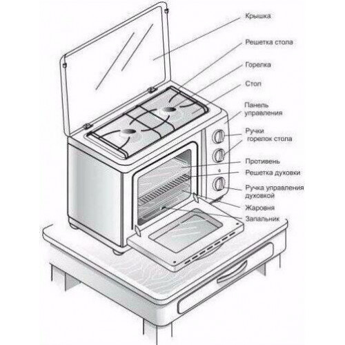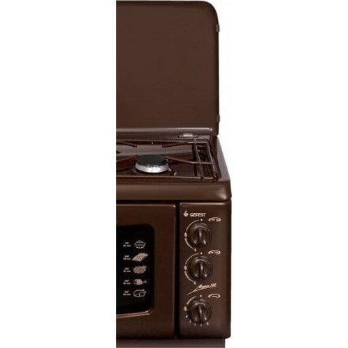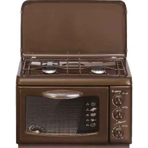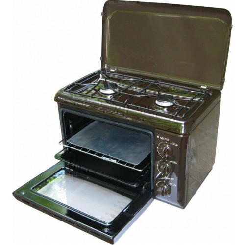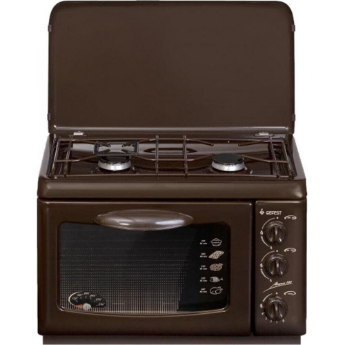 (ВхШхГ) 40х55х40см. 2 газовые горелки. Духовка газовая, объем 19л. Газ-контроль духовки. Фиксированное положение «малое пламя». Термоуказатель духовки. Двойное стекло дверцы духовки. Термостойкое эмалированное покрытие стола (корпуса). Коричневый.