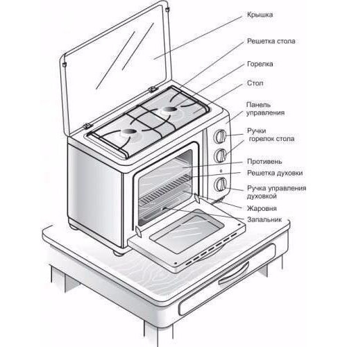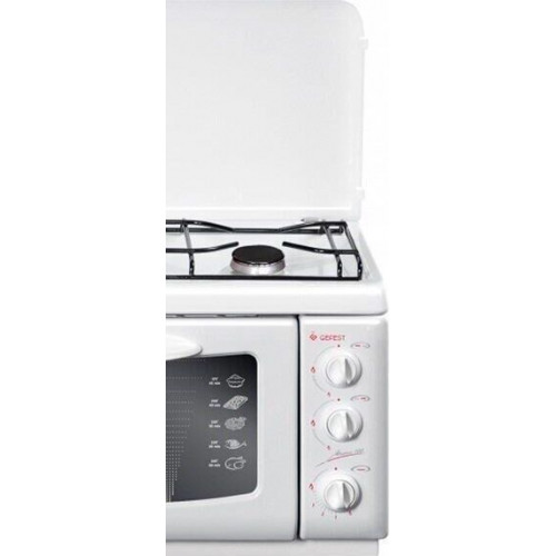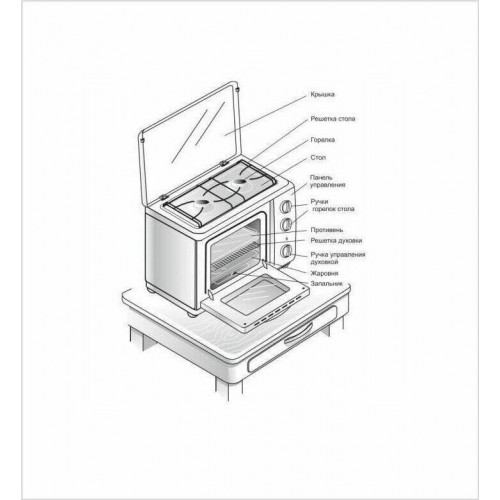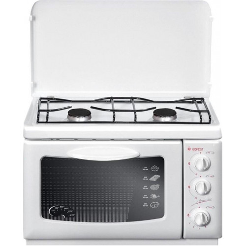 (ШхГхВ) 55х40х40см.Цвет белый.Объем духовки, л: 19.Тип: газовая.Количество зон приготовления: 2.Варочная поверхность: эмалированная.Фасад: эмалированный.Крышка: металлическая крышка.Масса нетто, кг: 17.2.