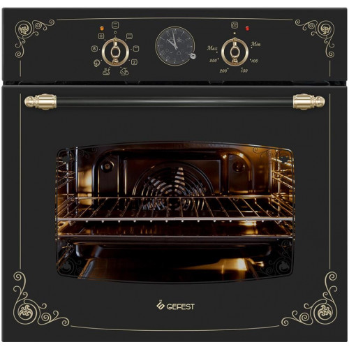 Духовой шкаф. Габаритные размеры ШхГхВ: 59.8х56.5х59.5 см Объём духовки: 55 л. Цвет: черный с рисунком "ретро". Фасад: эмалированный. Масса нетто,33.1кг. Диапазон номинальных напряжений, В: 220-230. Сетевой шнур и вилка: в наличии. Размеры монтажного проема, ШхГхВ, см: 55x54x57. Класс энергоэффективности: A. Класс электробезопасности: I. Гриль электрический. Таймер аналоговый. Подсветка духовки двойная. Усиленный гриль с конвекцией. Съемные проволочные направляющие духовки.