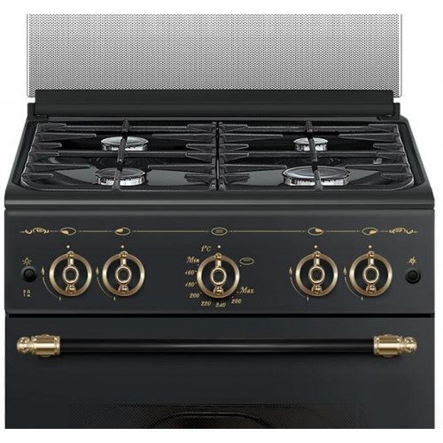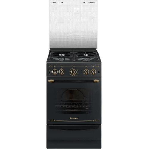 Габариты ШхГхВ: 50х58.5х85см; Ширина, см: 50; Цвет: с рисунком "ретро", черный; Дизайн: ретро; Фасад эмалированный; Варочная поверхность: эмалированная; Решетки стола: чугунные; Крышка стола: стеклянная; Класс электробезопасности: I; Газ-контроль духовки; Объем духовки, л: 52; Мощность горелки духовки, кВт: 3,1; Мощность гриль-горелки, кВт: 1,9; Электророзжиг духовки: кнопка на панели; Электророзжиг горелок стола: кнопка на панели; Гриль: газовый; Подсветка духовки; Направляющие духовки: съемные проволочные; Терморегулятор (термостат); Ящик для посуды и принадлежностей: выдвижной; Ножки регулировочные; Сетевой шнур и вилка; Стекло дверцы духовки: двойное; Комплектность: жаровня, накладка для посуды малого диаметра, противень, решетка духовки; Комплект сменных сопел