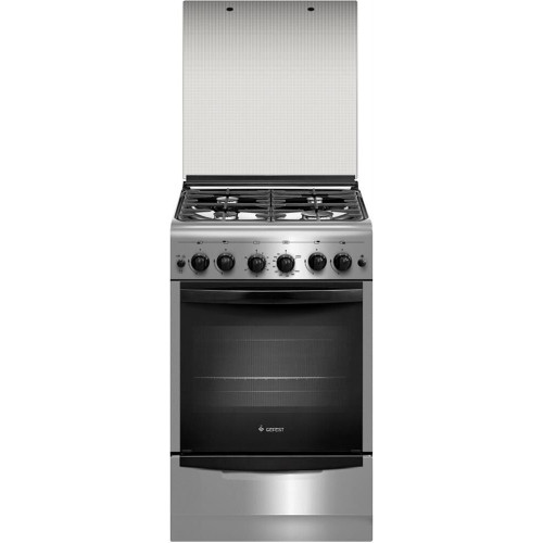 (ШхГхВ) 50x58,5x85 см. Варочная поверхность нержавеющая сталь. 4 газ. горелки. Электророзжиг горелок стола: кнопка розжига на панели. Гриль горелка. Полезный объём духовки 52 л. Таймер: механический. Газ-контроль духовки. Вертел с электроприводом. Направляющие духовки: съемные проволочные. Ящик для посуды и принадлежностей выдвижной. Подсветка духовки одинарная. Стеклянная крышка. Цвет: нержавеющая сталь.