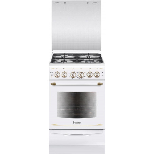 Габариты ШхГхВ: 50х58.5х85см; Ширина, см: 50; Цвет: белый, с рисунком "ретро"; Объем духовки, л: 52; Мощность горелки духовки, кВт: 3,1; Мощность гриль-горелки, кВт: 1,9; Варочная поверхность: эмалированная; Решетки стола чугунные; Крышка стола: стеклянная; Класс электробезопасности: I; Таймер механический; Газ-контроль духовки; Электророзжиг духовки: кнопка на панели; Электророзжиг горелок стола: кнопка на панели; Гриль: газовый; Вертел с электроприводом; ; Подсветка духовки; Направляющие духовки: съемные проволочные; Терморегулятор (термостат); Ящик для посуды и принадлежностей: выдвижной; Ножки регулировочные; Сетевой шнур и вилка: в наличии; Стекло дверцы духовки: двойное; Комплектность жаровня, накладка для посуды малого диаметра, противень, решетка духовки; Комплект сменных сопел