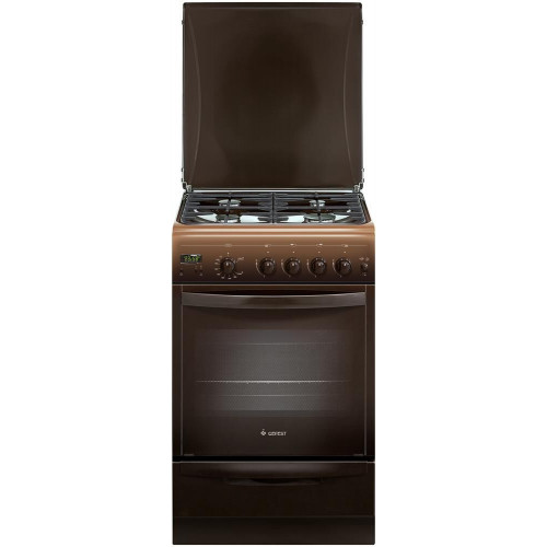 Габариты: 50х58.5х85 см. Полезный объем духовки: 52 л. 4 газ. конфорки. Таймер электронный. Газ-контроль горелок стола и духовки. Электророзжиг горелок стола и духовки. Вертел, Гриль, подсветка.; Цвет коричневый